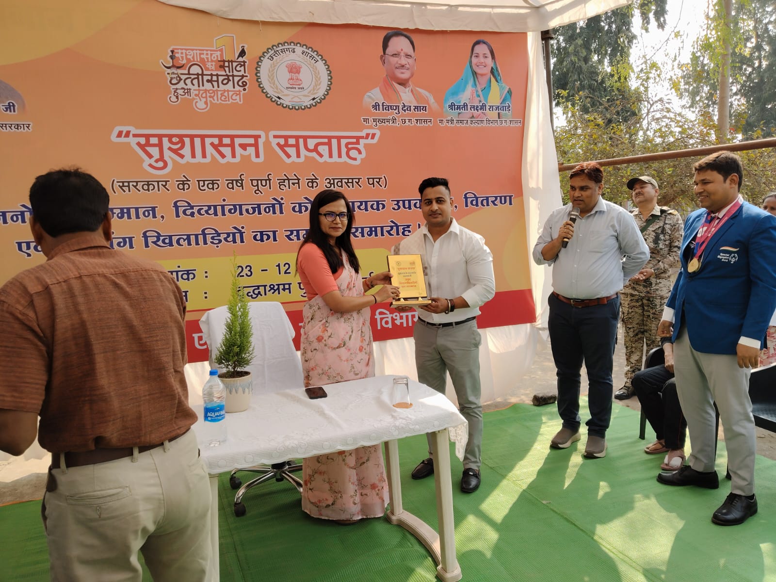 दुर्ग/ शासकीय वृद्धाश्रम पुलगांव दुर्ग में सरकार के एक वर्ष पूर्ण होने के उपलक्ष्य में सुशासन सप्ताह अन्तर्गत वरिष्ठजन, दिव्यांगजन, एवं ख्याति प्राप्त अंतर्राष्ट्रीय दिव्यांग खिलाड़ियों को सम्मिलित करते हुए सम्मान समारोह कार्यक्रम का आयोजन किया गया। विष्णु के सुशासन में दिव्यांगजनों को सम्मान मिल रहा है। समाज कल्याण द्वारा आयोजित इस कार्यक्रम में कलेक्टर सुश्री ऋचा प्रकाश चौधरी भी सम्मिलित हुई। इस दौरान उन्होंने अन्तर्राष्ट्रीय दिव्यांग खिलाड़ियों को उनकी उपलब्धि के लिए सम्मानित किया। जिसमें श्री श्रीमंत झा., श्री अनुराग सिंह, सुश्री संगीता मसीह शामिल है। कलेक्टर सुश्री चौधरी ने सरकार के एक वर्ष पूर्ण होने के अवसर पर समस्त जनों को अवगत कराते हुए सभी का अभिवादन किया और वृद्धजनों से मुलाकात कर उनका कुशल क्षेम पूंछा।