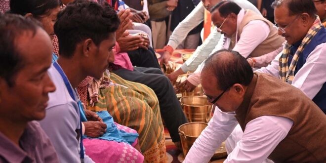 रायपुर. केंद्रीय कृषि तथा ग्रामीण विकास मंत्री श्री शिवराज सिंह चौहान और मुख्यमंत्री श्री विष्णु देव साय ने आज दुर्ग जिले के ग्राम नगपुरा में आयोजित मोर आवास मोर अधिकार कार्यक्रम में प्रधानमंत्री जनमन योजना, नियद नेल्ला नार योजना और प्रधानमंत्री आवास योजना के लाभार्थियों का पांव पखारकर अभिनंदन किया। इस अवसर पर उपमुख्यमंत्री द्वय श्री अरूण साव और श्री विजय शर्मा, कृषि मंत्री श्री रामविचार नेताम दुर्ग ग्रामीण विधायक ललित चंद्राकर सहित अन्य अतिथियों ने भी आवास योजना के लाभार्थियों का पांव पखार कर अभिनंदन किया।