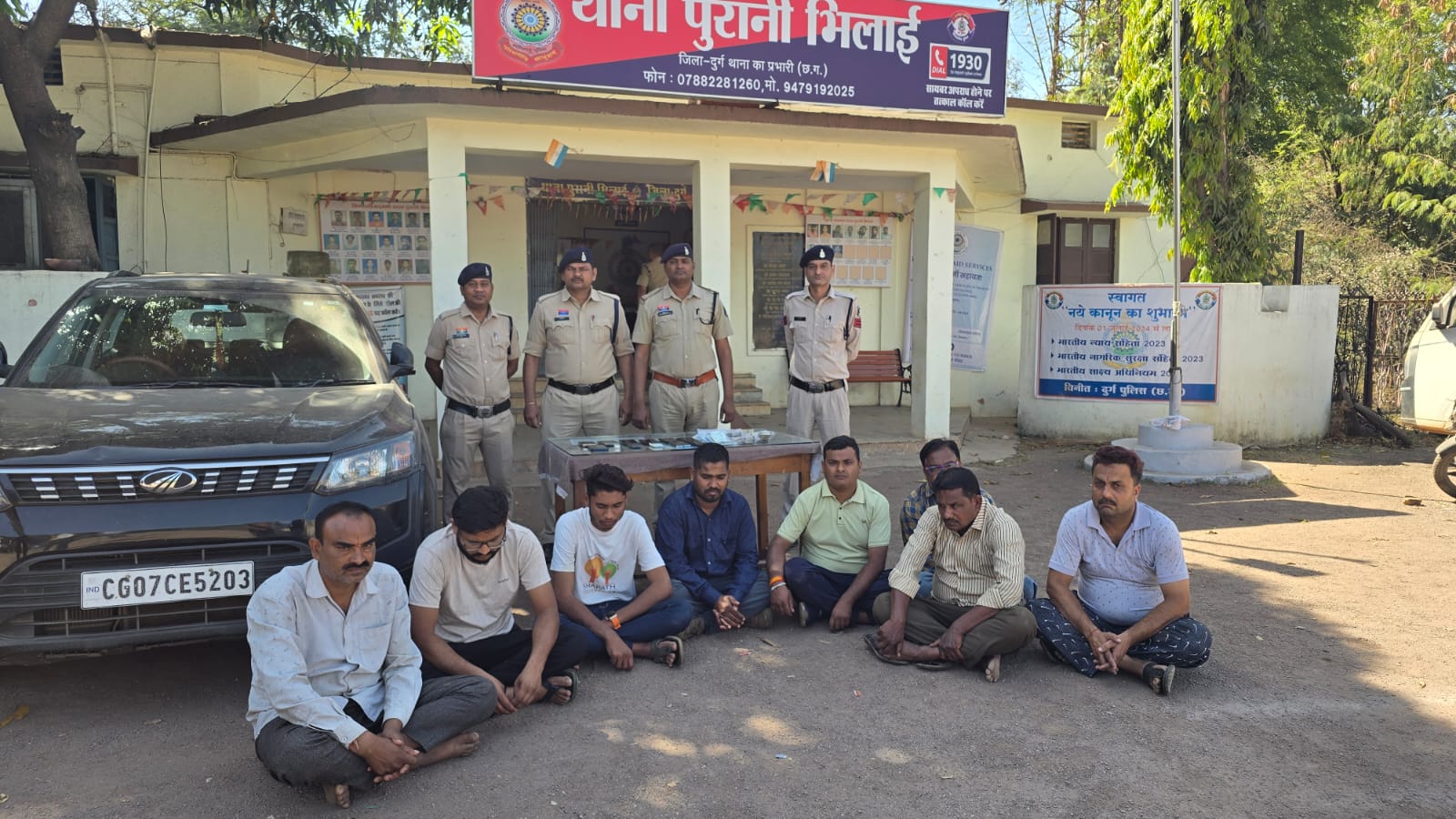थाना प्रभारी पुरानी भिलाई को टाउन पेट्रेलिंग के दौरान मुखबीर सूचना प्राप्त हुयी की थाना पुरानी भिलाई क्षेत्रांतर्गत ग्राम रिंगनी नाला के पास बाहरी लोगो के द्वारा अवैध रूप से 52 पत्ती ताश से रूपये पैसो का दांव लगाकर काट पत्ती नामक जुंआ खेलने की सूचना मिलने पर घटना की सूचना वरिष्ठ अधिकारियों को दिया गया, उक्त घटना को अत्यंत ही गंभीरता से लेते हुए श्रीमान पुलिस अधीक्षक महोदय श्री जितेन्द्र शुक्ला (भापुसे) के द्वारा त्वरित कार्यवाही हेतु निर्देश प्राप्त हुए थे। जिसके परिपालन में अतिरिक्त पुलिस अधीक्षक (शहर) भिलाई श्री सुखनंदन राठौर (रा.पु.से.), नगर पुलिस अधीक्षक छावनी श्री हरिश पाटिल (रा.पु.से.), क्राइम डीएसपी श्री हेम प्रकाश नायक। के मार्गदर्शन में एसीसीयु टीम एवं थाना प्रभारी पुरानी भिलाई निरीक्षक महेश कुमार ध्रुव के नेतृत्व में टीम मौके पर रवाना होकर घेराबंदी कर रेड कार्यवाही किया मौके पर पकड़े गये जुआड़ियान 1. पंकज सोनी पिता मनोज सोनी उम्र 32 वर्ष निवासी गया नगर इंडियन किड्स स्कुल के पास थाना कोतवाली दुर्ग, 2. बसंत कुमार सोनी पिता स्व. गोपाल सोनी उम्र 34 वर्ष निवासी राम नगर तुलसी किराना स्टोर्स के पास राम मंदिर के सामने थाना दुर्ग कोतवाली जिला दुर्ग 3. श्रवण ओडवानी पिता शंकर लाल ओडवानी उम्र 46 वर्ष निवासी पचरीपारा हास्पीटल कालोनी गणेश मंदिर के पास थाना दुर्ग कोतवाली जिला दुर्ग, 4. शंकर लाल चौधरी पिता स्व. रामनाथ चौधरी उम्र 48 वर्ष निवासी राव काटेज के पास सुभाष नगर कसारीडीह दुर्ग, थाना पद्मनाभपुर जिला दुर्ग, 5. विजय उर्फ विज्जु जैन पिता ज्ञानचंद जैन उम्र 48 वर्ष निवासी वार्ड क्र. 06 सब्जी मार्केट अरिहंत वस्त्रालय अहिवारा थाना नंदनी जिला दुर्ग, 6. आकाश जांगड़े पिता नंद किशोर जांगड़े उम्र 20 वर्ष निवासी ग्राम उमदा सतनामी पारा देव किराना स्टोर्स के पास थाना पुरानी भिलाई जिला दुर्ग, 7. मुरली साहू पिता स्व. बुधराम साहू उम्र 43 वर्ष निवासी ग्राम जेवरा सिरसा, वार्ड क्र. 08 सतनामी पारा पानी टंकी के पास चौकी जेवरा सिरसा थाना पुलगांव जिला दुर्ग, 8. नीरज जंघेल पिता मोतीराम जंघेल उम्र 35 वर्ष निवासी जयंती नगर अपना किराना दुकान के सामने सिकोलाभाठा दुर्ग थाना मोहन नगर जिला दुर्ग के पास एवं फड़ से नगदी रकम 221000 रूपये एवं 05 बंडल 52 पत्ती ताश, 11 नग विभिन्न कंपनियों का मोबाइल जुमला कीमती 155000 /- रूपये, एक मक्खी माईक्रो माईक कीमती 10000 रू, व घटना स्थल के पास में एक ग्न्ट300 क्रमांक ब्ळ 07 ब्म् 5203 कीमती 300000 रू जुमला कीमती 686000 रूपये को जप्त कर वजह सबूत कब्जा पुलिस लिया गया। मौके पर जुआड़ियानों से पूछताछ किया गया जो निर्मल भारती निवासी पथर्रा, पंकज रात्रे निवासी उमदा के द्वारा प्रत्येक जुआड़ियानों से 500-500 रू लेकर जुंआ खेलवाना एवं ज