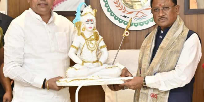 यशस्वी मुख्यमंत्री श्री विष्णु देव साय जी से भेंट कर महाकाल का अंगोछा एवं भगवान महादेव की प्रतिमा अर्पित कर सौजन्य मुलाकात किया।