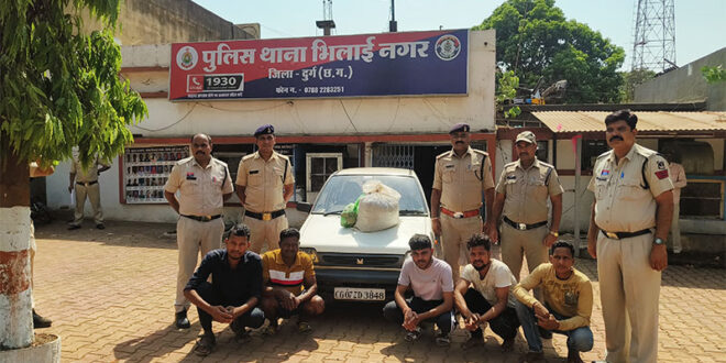 टीम द्वारा अवैध नशे के कारोबारियों / संदेहियों के उपर सतत निगरानी रखी जा रही थी , पतासाजी हेतु विशेष सूत्र लगाये गये थे इसी दौरान दिनांक 21.04.2025 दिन सोमवार को विशेष सूत्रो से सूचना प्राप्त हुआ कि, हास्पिटल सेक्टर निवासी सोनु ठाकुर अपने साथियों के साथ एक सफेद रंग के मारुति 800 कार मे नशीला पदार्थ (गांजा) की खरीदी बिक्री करने हेतु महाराणा प्रताप भवन के पीछे रेलवे स्टेशन रोड सीनू डेली नीड्स सेक्टर 07 भिलाई के पास एकत्र होकर मारुति 800 वाहन मे बैठा हुआ है | जिसकी सूचना पर टीम द्वारा एनडीपीएस. एक्ट के प्रावधानो के मुताबिक मुखबीर सूचना पंचनामा तैयार कर वरिष्ठ अधिकारियों को सूचना से अवगत करवाकर, गवाहन को थाना तलब कर ,हमराह स्टाफ एवं गवाहन के रवाना होकर घटनास्थल पहुंचकर घेराबंदी कर एक सफेद रंग की कार मे बैठे सोनु ठाकुर , सोम चंदेल , दिलीप कुमार भोई , प्रेमराजकुमुरा , कोडरधर पात्रो को पकड़ा गया जिनसे पुछताछ करने पर आरोपियों के द्वारा बताया गया कि, कोदड़धर पात्रा अपने साथी प्रेमराज कुमुरा एवं दिलीपचंद भोई के साथ मिलकर गांजा को अलग अलग थैले मे रखकर ट्रेन से भिलाई नगर रेलवे स्टेशन आता था जिसे लेने के लिये सोनु ठाकुर एवं सोम चंदेल आकर कार से उतई लेकर जाते थे जिसके बाद उतई एवं भिलाई मे विक्रय कर देते थे | आरोपीगणो के द्वारा उड़िसा से लाये गये गांजा कार मे रखकर रेलवे स्टेशन भिलाई नगर के पास कार मे बैठकर खरीदी बिक्री का हिसाब किताब करना करने हेतु एकत्रित होना बताया गया जिनके कब्जे से एक सफेद रंग की मारुति 800 कार क्रमांक CG 07 ZD 3848 के अंदर रखे एक सफेद रंग की बोरी के अंदर अलग अलग 07 पैकेट मे रखे मादक द्रब्य गांजा 07.48 किलोग्राम बोरी सहित व शुद्ध गांजा वजनी 07.055 किलोग्राम एवं मादक पदार्थ खरीदी बिक्री के नगदी रकम 2400 रुपये 06 नग मोबाईल फोन , एक एटीएम कार्ड एक पेन कार्ड एवं इलेक्ट्रानिक तौल मशीन जुमला कीमती 135000 रुपये को इनके संयुक्त कब्जे से जब्त कर कब्जा पुलिस लिया गया मौके पर विधिवत अपराध क्रमांक 161/2025 धारा 20(ख), 27(क ) एनडीपीएस. एक्ट के तहत कार्यवाही कर अग्रीम कार्यवाही थाना भिलाई नगर से की जा रही है |