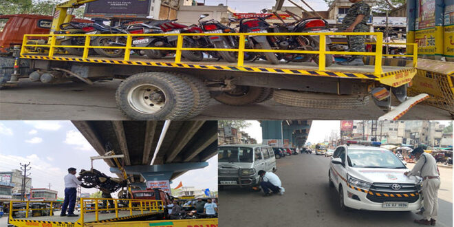आज दिनांक को यातायात पुलिस दुर्ग द्वारा नो पार्किग में खडी वाहनों पर अभियान कार्यवाही की गई यातायात पुलिस दुर्ग द्वारा लगातार ब्रिज के नीचे वाहन न खडा करने हेतु समझाईस दिये जाने के बावजूद वाहन चालको द्वारा कुम्हारी, सुपेला,पावर हाउस,ब्रिज के नीचे वाहन खडा किया गया था जिस पर दो पहिया वाहनों को क्रेन से उठाकर यातायात कार्यालय लाया गया एवं चार पहिया वाहनो में लॉक लगाने की कार्यवाही की गई इसी प्रकार नेहरू नगर एवं इंदिरा मार्केट मार्ग में सडक पर वाहन खडी करने वाले वाहन चालको पर मोटर व्हीकल एक्ट की धारा नो पार्किग के तहत कार्यवाही की गई साथ ही मालवीय नगर से पुलगांव चौक तक सडक एवं सडक किनारे बस खडी करने वाले पर भी कार्यवाही की गई।