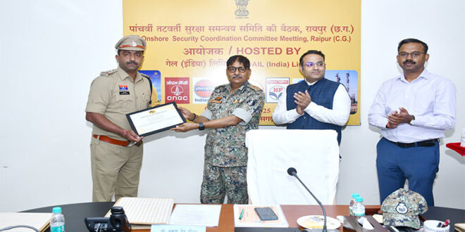 निरीक्षक मनीष शर्मा थाना प्रभारी थाना नन्दिनी जिला दुर्ग को दिनांक 23/05/2025 को पुलिस मुख्यालय नया रायपुर में Onshore security Co-ordination committee की आयोजित मीटिंग में पुलिस महानिदेशक महोदय की अध्यक्षता में सम्मान किया गया ।