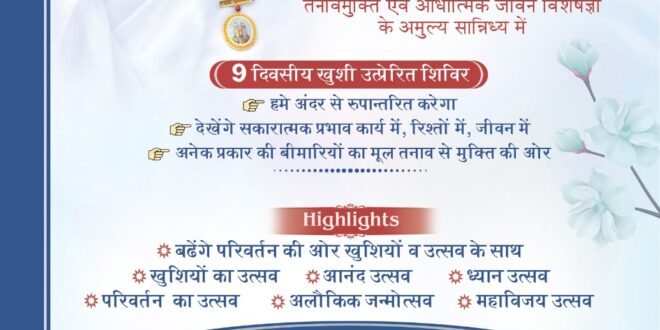 यह नौ दिवसीय अलविदा तनाव शिविर तनाव मुक्ति एवं आध्यात्मिक जीवन की विशेषज्ञा ब्रह्माकुमारी पूनम बहन (C.S) के सानिध्य में सम्पन्न होगा।