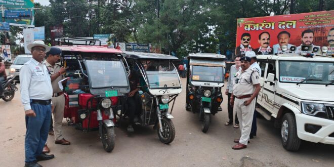 यातायात पुलिस दुर्ग द्वारा कल दिनांक को ई रिक्शा एवं ऑटो चालको का लिस्टिंग करने हेतु शहर के प्रमुख भीड भाड वाले स्थान जैसे दुर्ग रेलवे स्टेशन, दुर्ग बस स्टेण्ड, पावर हाउस रेलवे स्टेशन, रेलवे स्टेशन भिलाई 03, रेलवे स्टेशन सेक्टर 01 में चेकिंग किया गया और सभी को समझाईश दी गयी की वाहन के सम्पूर्ण कागजात पूर्ण रखे, बिना लाइसेंस वाहन ना चलाये, नाबालिक को वाहन चलाने ना दे, बिना वर्दी वाहन ना चलाये, नो पार्किग में वाहन खडा ना करें, अधिक सवारी ना बैठाये, समझाईश दी गयी। साथ ही चालकों का वाहन नंबर, पता, नाम मोबाइल नंबर नोट किया गया। ताकी भविष्य में इन्हे प्रशिक्षण दे कर निर्धारित रुट में चलने हेतु निर्देशित किया जा सके। समझाईश के साथ यातायात पुलिस दुर्ग द्वारा लापरवाह कुल-55 ई रिक्शा एवं ऑटो चालको पर कार्यवाही भी किया गया।