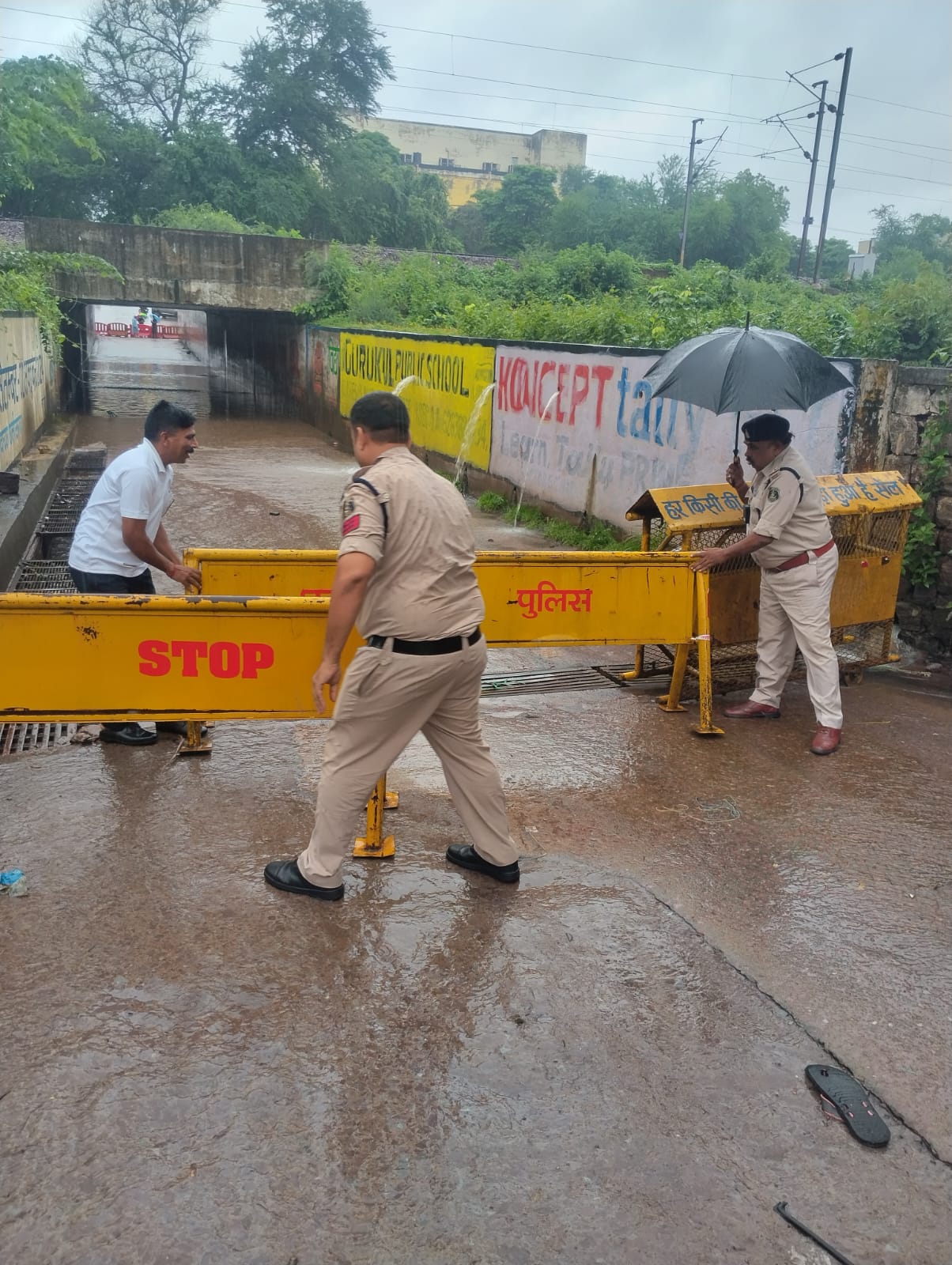 यातायात पुलिस दुर्ग द्वारा पिछले 48 घंटे से हो रही लगातार बारिस के दौरान भी सडक पर वाहनो का आवागमन सुरक्षित एवं सुगम बना रहे, इस हेतु लगातार पेट्रोलिंग किया जा रहा है सडक में किसी प्रकार का वाहन खराब हो जाने पर उसके पीछे स्टॉपर लगाकर वाहन को क्रेन की सहायता से किनारे लगाने का कार्य, बारिश एवं हवा तूफान से पेड़ गिरने पर गिरे हुए पेड़ को हटाने का कार्य, अण्डर ब्रिज में भारी बारिश गिरने के कारण, भर जाने पर स्टॉपर लगाकर मार्ग बंद करने का कार्य और उसे चेक करने की कार्यवाही, नेशनल हाईवे में किसी प्रकार के वाहन खडा ना हो एवं खडे वाहनों को हटाने की कार्यवाही कर मार्ग कर सुरक्षित एवं सुगम बनाने का कार्य यातायात पुलिस दुर्ग द्वारा किया जा रहा है।