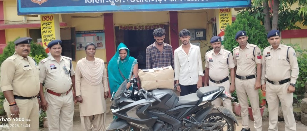 दुर्ग पुलिस व्दारा अवैध मादक पदार्थो के बिक्री एवं परिवहन पर रोक लगाने के क्रम में थाना अंडा पुलिस को दिनांक 17.07.2025 को मुखबिर से सूचना मिला की दो लडके अपने मोटर सायकल मे अवैध रूप से मादक पदार्थ गांजा ला रहे है। सूचना तस्दीक एवं रेड कार्यवाही के दौरान मुखबिर के बताये हुलिए के अनुसार गीता पेट्रोल पंप के पास मेन रोड मे दो संदिग्ध व्यक्ति दिखे जिसे रोककर तलाशी लिया गया। आरोपीगण नीतेश एवं रणवीर के पास मोटर सायकल के बीच मे एक हरा रंग के बैग के अंदर 04 किलो मादक पदार्थ गांजा मिला । आरोपीगण द्वारा पुछताछ पर बताया कि आरोपिया गीतांजली द्वारा गांजा खरीद कर लाने के लिए 20,000/- रूपये देना बताए। प्रकरण मे आरोपिया गीतांजली निवासी जंजगिरी रोड अण्डा को महिला आरक्षक की उपस्थिति मे घटना के संबंध मे पूछताछ किया गया जो उक्त दोनो आरोपियो को गांजा लाने हेतु रूपये पैसे देना एवं बिक्री रकम को आपस मे बटवारा करना बताया। आरोपीगण का उक्त कृत्य अपराध धारा 20 ख एनडीपीएस एक्ट का पाये जाने से अपराध पंजीबद्ध कर विवेचना मे लिया गया है। गिरफ़तार आरोपीगण को माननीय न्यायालय पेश कर जेल दाखिल किया गया है।