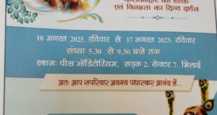 भिलाई। श्रीकृष्ण जन्माष्टमी के पावन पर्व पर अंतर्राष्ट्रीय संस्था प्रजापिता ब्रह्माकुमारी ईश्वरीय विश्व विद्यालय द्वारा दिनांक 10 अगस्त रविवार से 17 अगस्त 2025, रविवार तक प्रतिदिन संध्या 6:30 से 9:30 बजे तक सेक्टर-7, सड़क-2, स्थित पीस ऑडिटोरियम में आयोजित भव्य एवं आकर्षक झांकी का आयोजन किया जा रहा है, जिसमें …