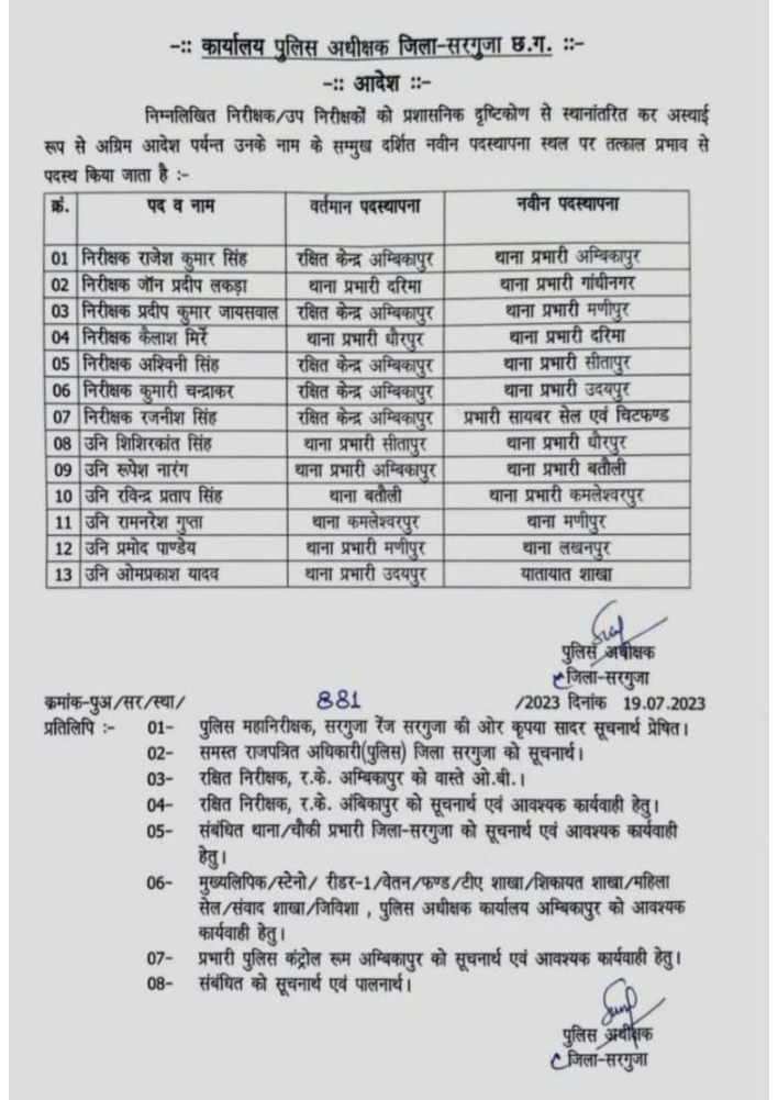 अंबिकापुर। जिले के पुलिस विभाग में फेरबदल हुआ है। सरगुजा एसपी सुनील शर्मा ने आदेश जारी कर 13 थाना प्रभारियों का तबादला कर दिया है।