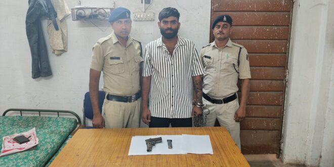 भिलाई। दिनांक 15.09.2024 को मुखबीर से सूचना मिला कि इंदर सिंह जो कि डबरा पारा चौक अशोक मुर्ति के पास खुर्सीपार में एक व्यक्ति अपने कमर के पीछे पिस्टल छिपा कर रखा है कि सूचना वरिष्ठ अधिकारियो को दी गई जिस पर वरिष्ठगण पुलिस अधीक्षक दुर्ग श्री जितेन्द्र शुक्ला के निर्देशन पर अतिरिक्त पुलिस अधीक्षक सुखनंदन राठौर, एवं नगर पुलिस अधीक्षक श्री हरिश पाटिल के मार्गदर्शन पर थाना प्रभारी श्री अम्बर सिंह भारद्वाज के दिशा निर्देश पर हमराह प्रधान आरक्षक जितेन्द्र शुक्ला आरक्षक अमन शर्मा, पंकज सिंह डबरा पारा चौक अशोक मुर्ति के पास खुर्सीपार पहुंचकर मुखबीर के बताये हुलिये के व्यक्ति को घेराबंदी कर पकडा गया जिसकी तलाशी लेने पर इंदर सिंह ने कमर के पीछे छिपाकर एक पिस्टल गैग्जीन लगा हुआ मैग्जीन के अंदर 02 कारतुस जुमला कीमती 20,500 रूपये रखा मिला जिसे पूछताछ करने पर लोगो को डराने के लिए उपयोग करना बताया आरोपी इंदर सिंह पिता चरणजीत सिंह उम्र 24 साल साकिन केनाल रोड जोन 2 वार्ड 34 सेक्टर 11 खुर्सीपार को दिनांक 15.09.24 को विधिवत गिरफ्तार कर थाना लाया गिरफ्तारी की सूचना परिजन को दी गई। आरोपी के विरूद्ध धारा 25(1ए) आर्म्स एक्ट तहत अपराध दर्ज कर माननीय न्यायालय पेश किया जा रहा है।