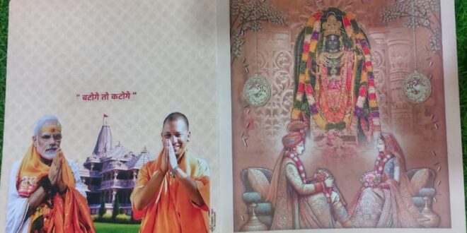 “बंटोगे तो कटोगे” .. योगी आदित्यनाथ का ये नारा अब शादी के कार्ड पर छपने लगा है. कार्ड पर पीएम मोदी के संग उनकी फ़ोटो लगी है. रामलला की फोटो भी कवर पर है. गुजरात में भावनगर के एक व्यक्ति ने ये शादी कार्ड बनवाया है