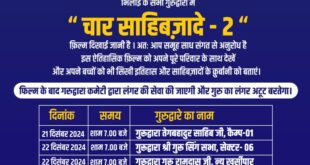 Read More »गुरुद्वारा प्रबंधक कमेटी के द्वारा 21 दिसंबर से 30 दिसंबर 2024 तक भिलाई के सभी गुरुद्वारों मे “ चार साहिबज़ादे – 2 “फ़िल्म दिखाई जानी है
