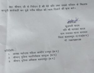 उल्लेखनीय है पुलिस के द्वारा कोई कार्यवाही नहीं होने के कारण आए दिन भागवत यादव द्वारा अपनी पत्नी को धमकी दे रहा है। कि पांच लाख रूपये लेले और राजी नाम हो जाओं नही ंतो तुम को मारकर फेंक दूगा। श्रीमती फूलमती यादव द्वारा महिला आयोग रायपुर पुलिस महानिरीक्षक सरगुजा पुलिस अधीयक्षक बलरामपुर को लिखित षिकायत देकर न्याय की गुहार लगाई है देखना यह कि छ.ग. षासन प्रषासन इस पर क्या कदम उठाता है़?