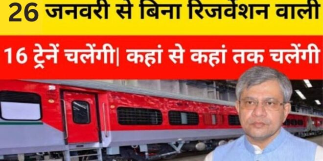 भारतीय रेलवे ने यात्रियों के लिए एक बड़ी सुविधा की घोषणा की है। 26 जनवरी 2025 से देश भर में 16 नई ट्रेनें बिना रिजर्वेशन के चलाई जाएंगी। इन ट्रेनों का मुख्य उद्देश्य यात्रियों को बिना आरक्षण के आसानी से यात्रा करने की सुविधा प्रदान करना है। यह कदम उन यात्रियों के लिए विशेष रूप से फायदेमंद होगा जो अक्सर तत्काल यात्रा करते हैं या जिन्हें अचानक यात्रा करनी पड़ती है।