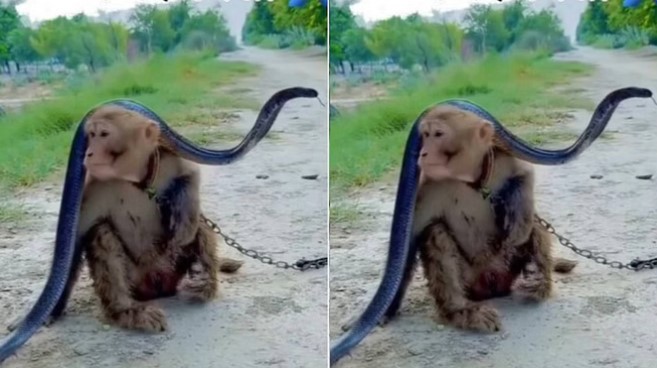 वीडियो किसी गांव की कच्ची सड़क का लगता है। इसकी शुरुआत में एक बंदर को एक सांप के सामने सिर झुकाते हुए देखा जा सकता है। वहीं, सांप एक जगह सीधा खड़ा नजर आता है। इस वीडियो में जो चीज सबसे ज्यादा ध्यान खींचती है वह है सांप के गले में बंधी लोहे की चेन, जिससे ऐसा लगता है कि यह शायद किसी का पालतू सांप हो।
