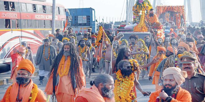 श्रद्धालुओं और महाकुम्भ प्रशासन ने संतों का पुष्प वर्षा से हुआ स्वागत