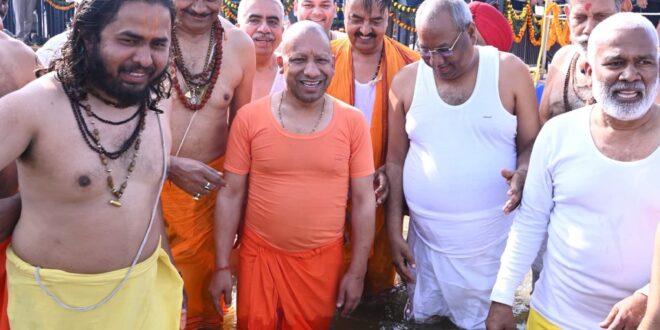 महाकुम्भ नगर : उत्तर प्रदेश के मुख्यमंत्री योगी आदित्यनाथ ने बुधवार को अपने मंत्रिमंडल के साथ संगम में पावन डुबकी लगाकर समूचे विश्व के कल्याण की कामना की। त्रिवेणी संकुल में बैठक के बाद अरैल घाट पर बनी जेटी से मोटरबोट में सवार होकर मंत्रिमंडल के सहयोगियों के साथ मुख्यमंत्री संगम पहुंचे। घाट पर बैंड की धुन पर बज रहे ‘मेरी झोपड़ी के भाग्य आज खुल जाएंगे’, ‘मईया ओ गंगा मईया’, ‘सजा लो घर को गुलशन सा’ और ‘तेरी मंद मंद मुसकनिया पर बलिहार राघव जी’ आदि भजनों के बीच मुख्यमंत्री खासे प्रसन्न दिखे।